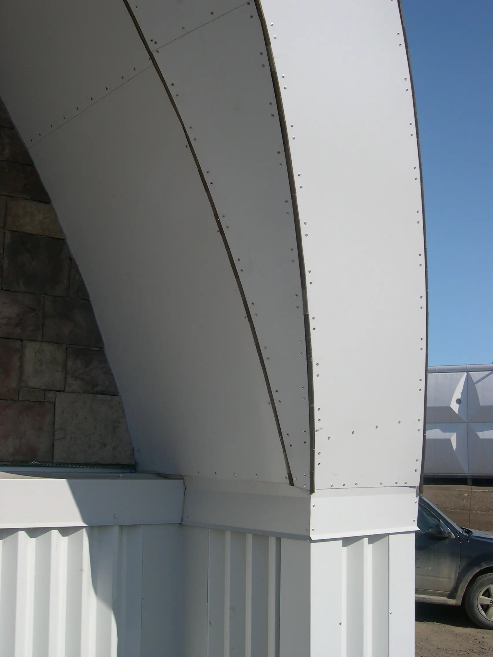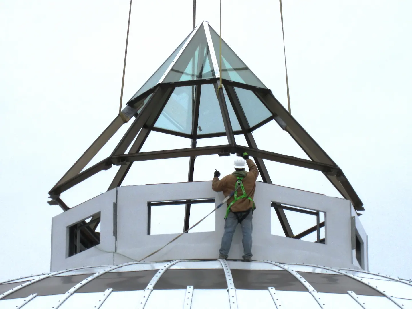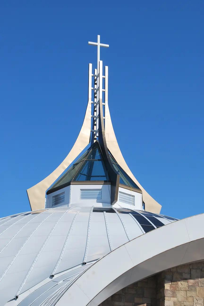 Canaletas especialmente diseñadas facilitan la transición entre el domo y la bóveda, garantizando la impermeabilidad de la estructura. En el ápice, una aguja de 12.3 metros coronada por una cruz incorpora una claraboya que permite la entrada de luz natural al santuario. El diseño y los detalles cumplen con el Código Nacional de Edificación de Canadá.