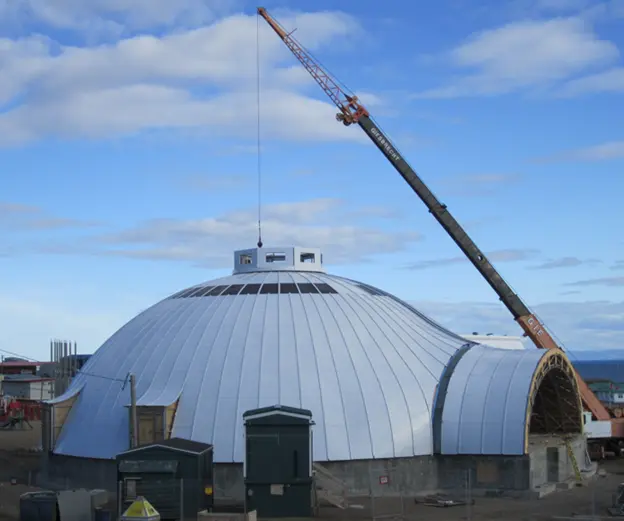 Los componentes modulares facilitaron un proceso eficiente en un clima severo. Las canaletas personalizadas en la unión entre el domo y la bóveda fueron esenciales para mantener la estanqueidad del sistema. La participación de mano de obra local, bajo supervisión técnica, permitió completar el montaje dentro del plazo previsto y fortalecer el sentido de pertenencia comunitaria.